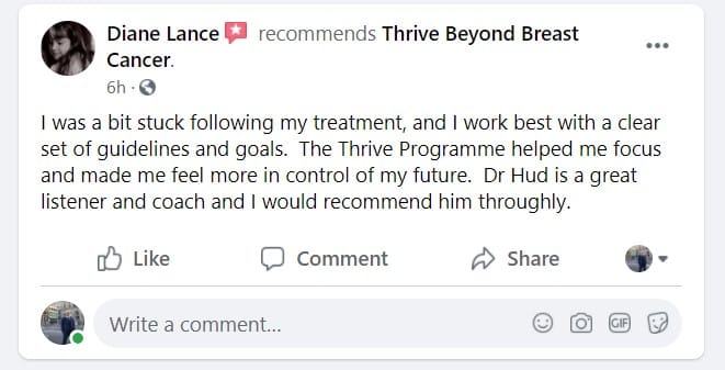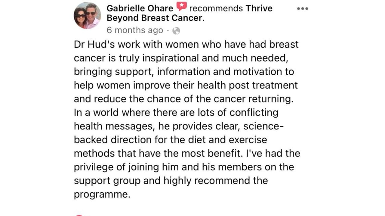 Dr Hud is a member of the UK and international Health Coaching associations and has experience in working with many women after breast cancer guiding to take the best steps to optimise their healths after breast cancer treatment